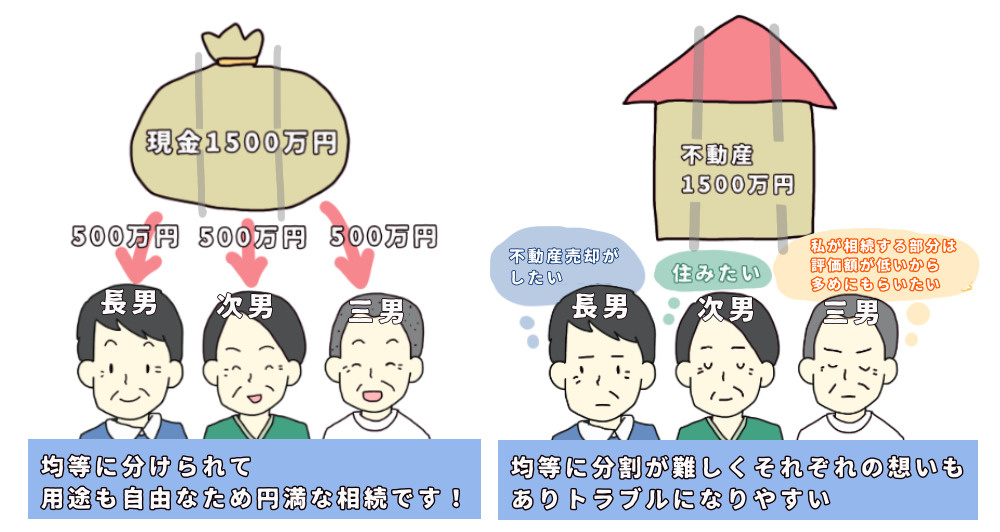 | 争い・不公平感の防止 | 現金という資産形態にすることで、相続人間の意見の食い違いや争いを避けられます。 | 評価額の恣意性によるトラブルも避けられます。 |